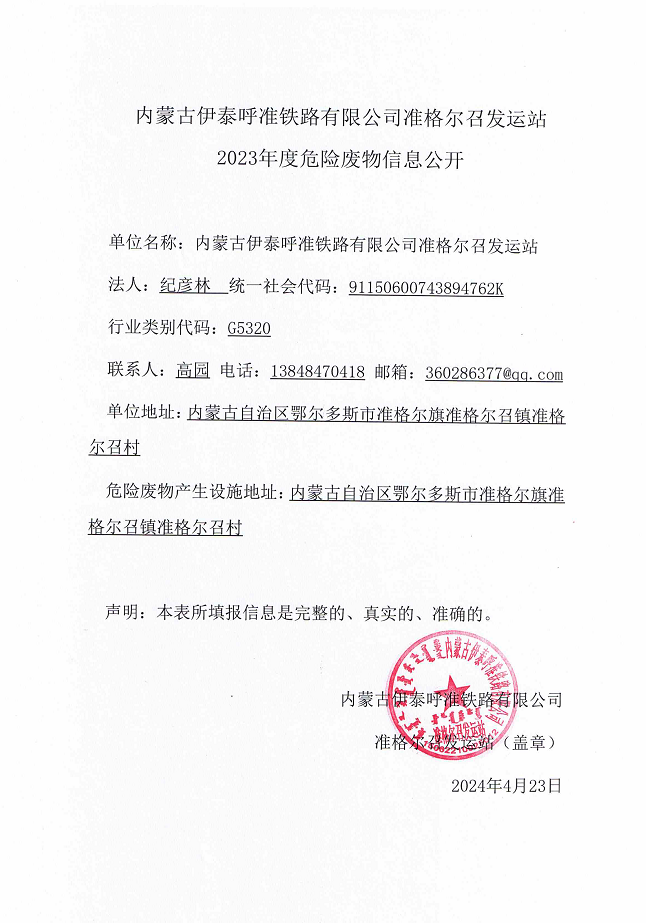 内蒙古伊泰呼准铁路有限公司准格尔召����� �������Ƴ������������ �������Ƴ����������� �������Ƴ����������� �������Ƴ�������发运站 2023年度危险����� �������Ƴ������������ �������Ƴ������������ �������Ƴ������������ �������Ƴ�������废物信息公开